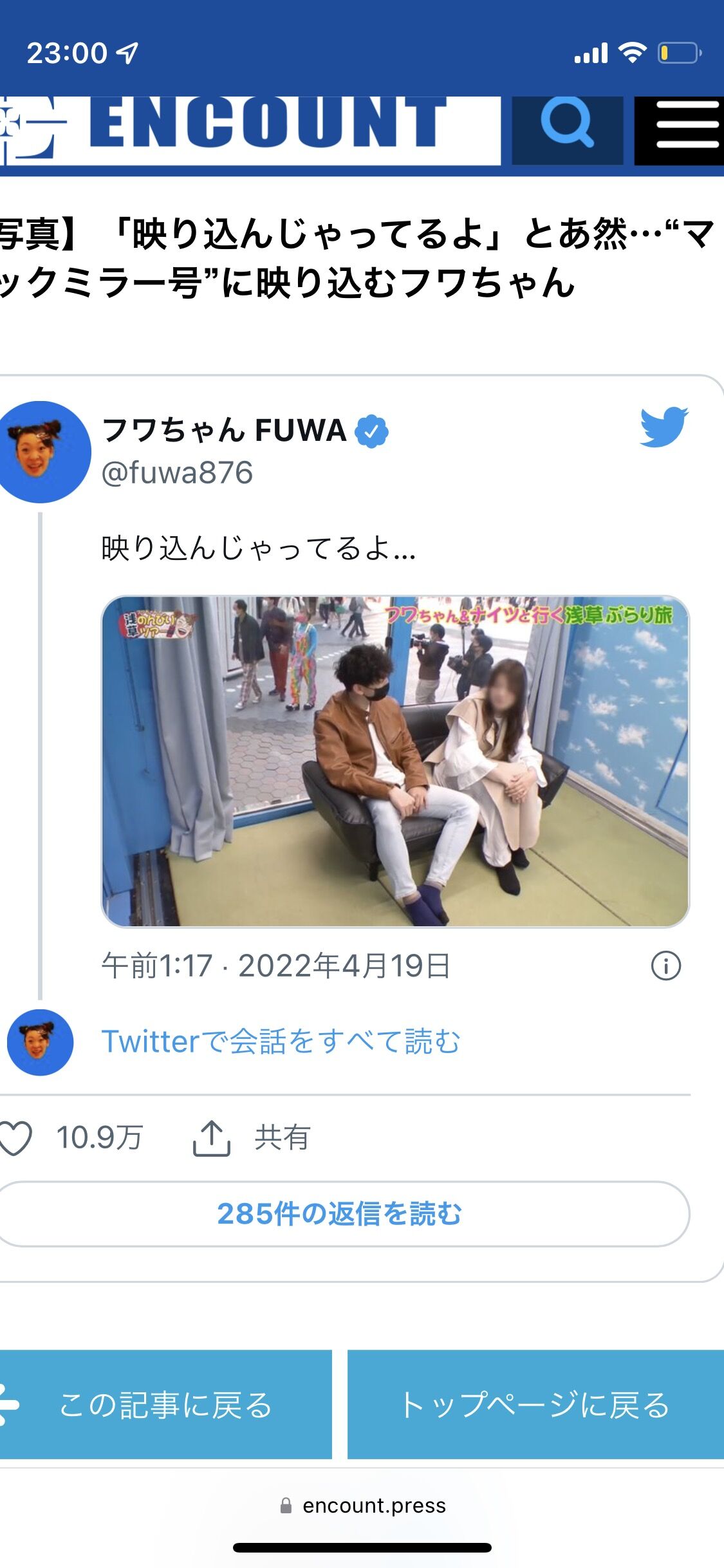 ・フワちゃんが浅草を訪れ、おすすめスポットを紹介するという内容になるはずだったが、なんと「スタッフがロケの映像データを紛失した」という。防犯カメラの映像や、ユーチューバーの撮影に映り込んだロケ当日のフワちゃんをひたすら切り抜いてつなげ、足りない部分は紙芝居で補うなどして番組放送にこぎつけた。その中の一場面として使用されたのが、前述の「マジックミラー張りのトラック」からの映像だった。