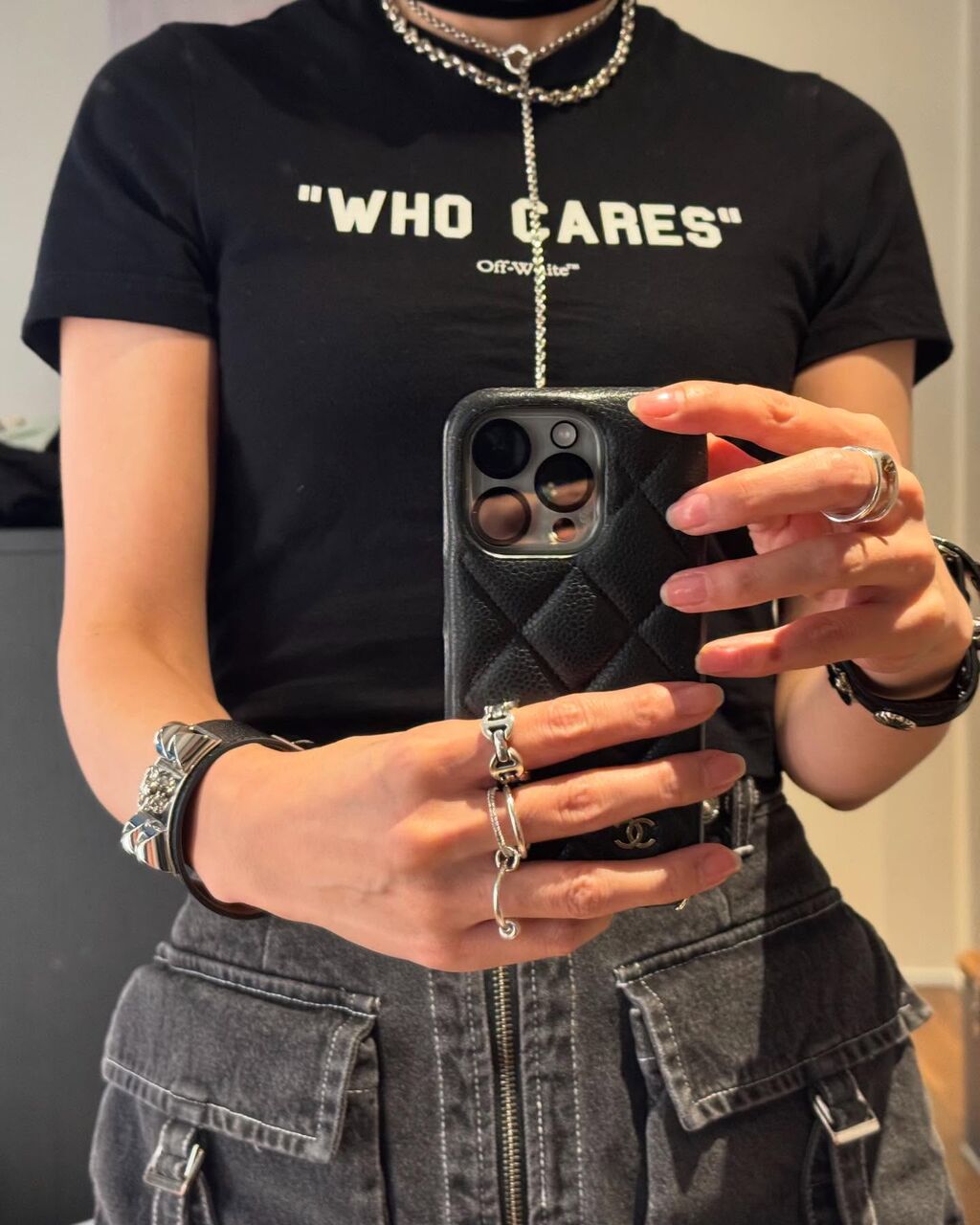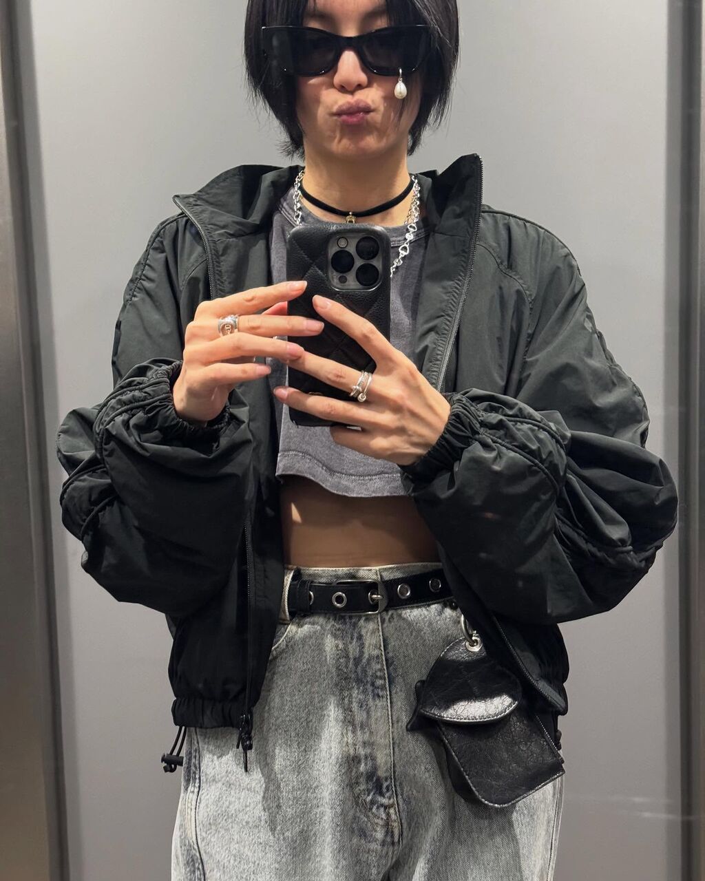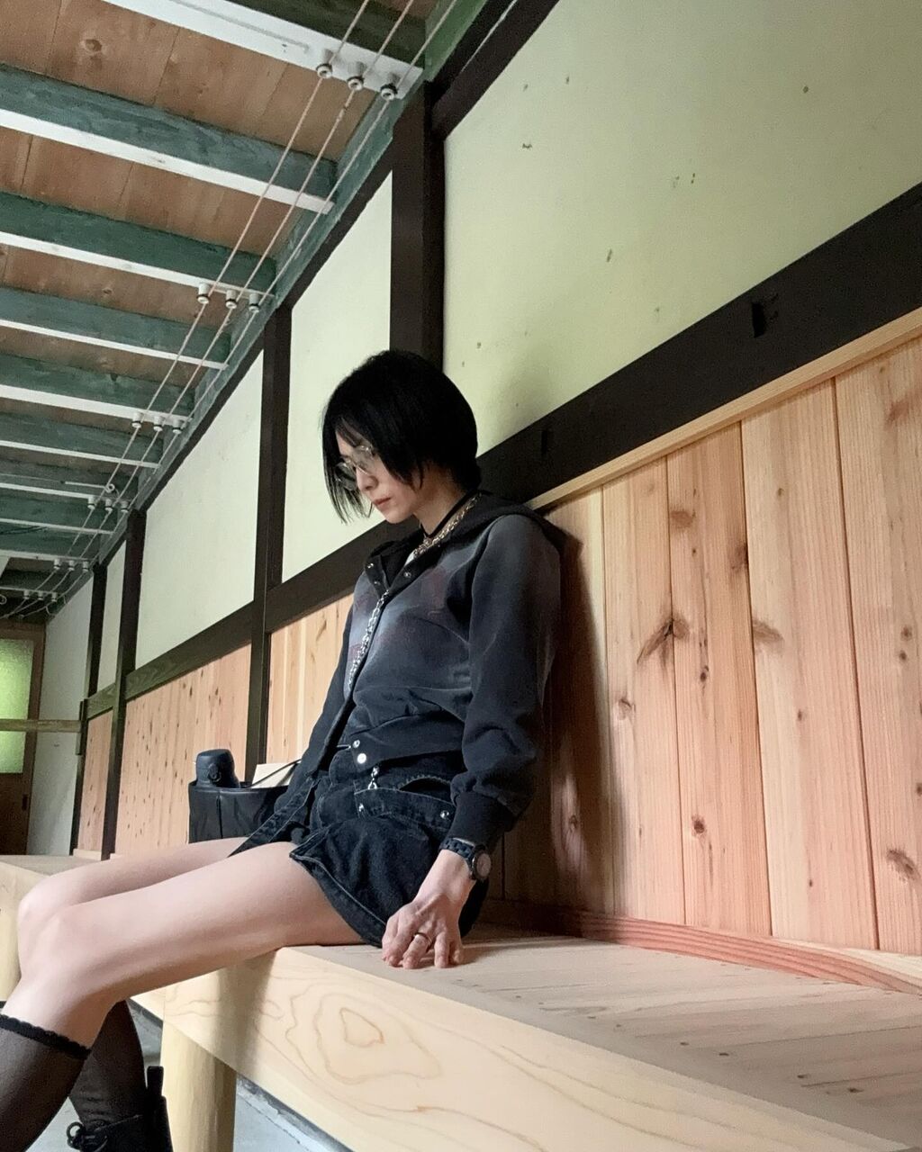 自然体で木のベンチに座る写真では、超ミニ丈のボトムスから大胆に太ももをのぞかせている。ファッションに合わせた存在感のあるシルバーアクセサリーの写真もアップした。